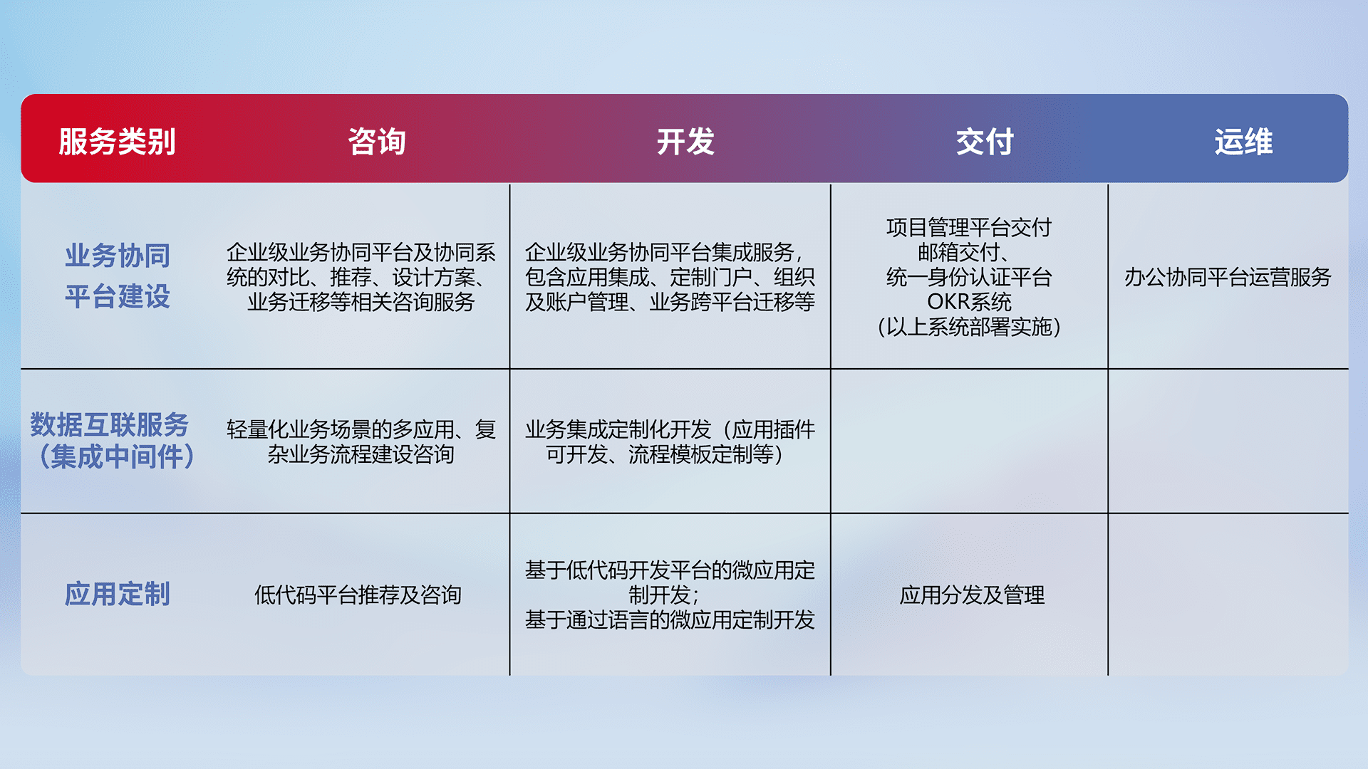 针对钉钉、、、企微、、、、IDaas等平台级产品提供产品的规划、、方案、、、、交付、、、、定制化开发等服务,,,实现如统一协同办公、、、、智能客户服务、、、混合会议管理、、智能数据查询、、等业务场景,,实现数字化转型。。。。