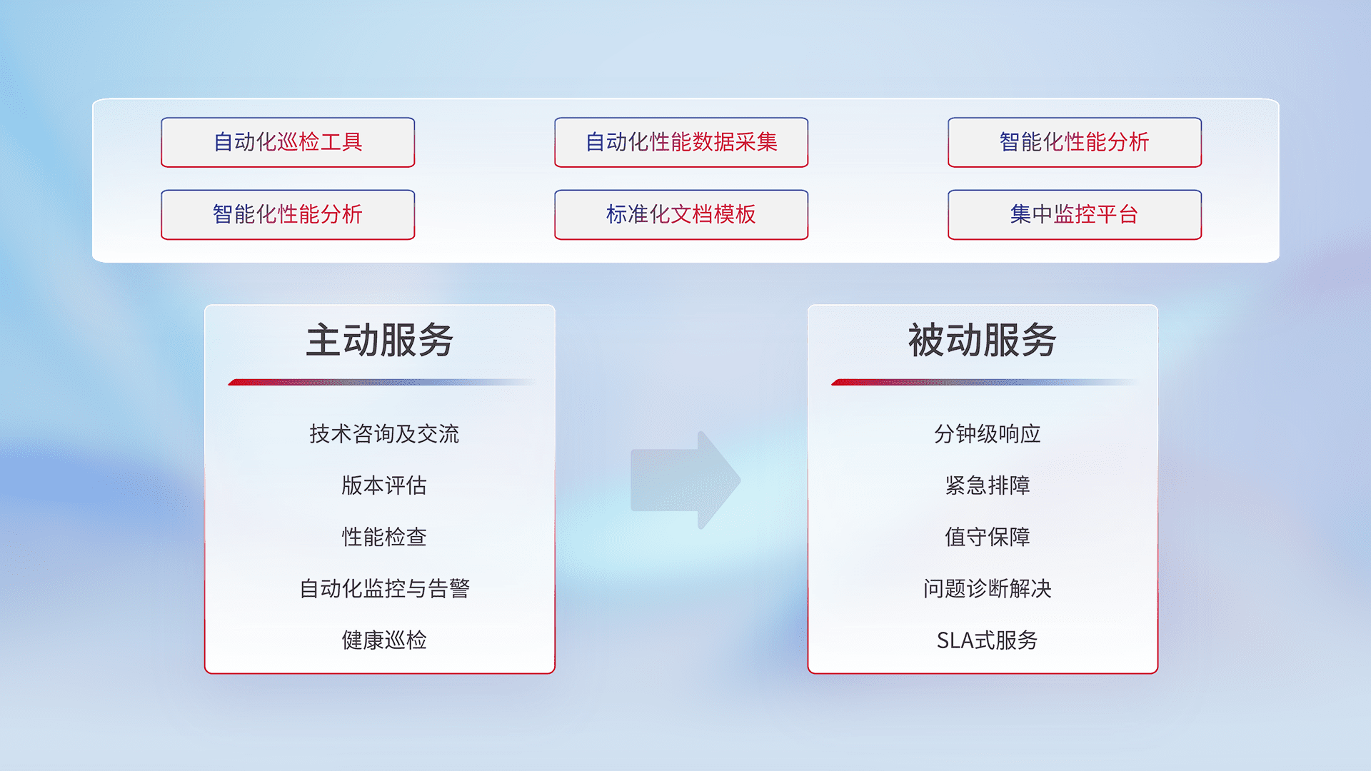 智能化工具和标准化文档,,,,保障服务质量,,,提供主动服务(包含技术咨询、、版本评估、、、、性能检查、、自动化监控与告警、、健康巡检)和被动服务包含(分钟级响应、、、、紧急排障、、、、值守保障、、、问题诊断解决、、、SLA服务)。。