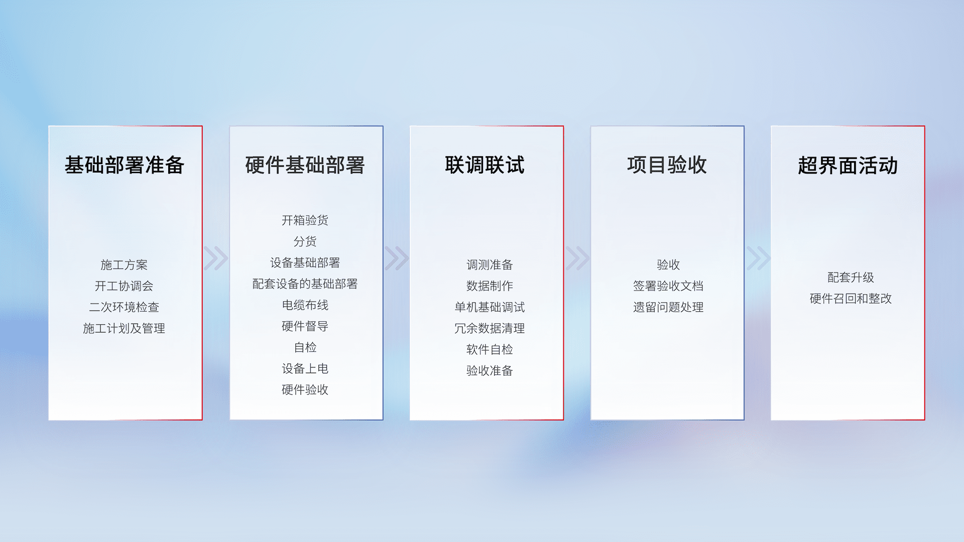 从基础部署准备、、、、硬件基础部署、、、联调联试、、、、项目验收、、、、越界面活动的全过程可追溯,,,,保证施工质量和进度。。。。
